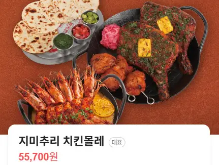 - 지미추리 치킨몰레: 55,700원 - 지미추리 소스를 듬뿍 올린 멕시칸 간장치킨과 녹진한 버터몰레